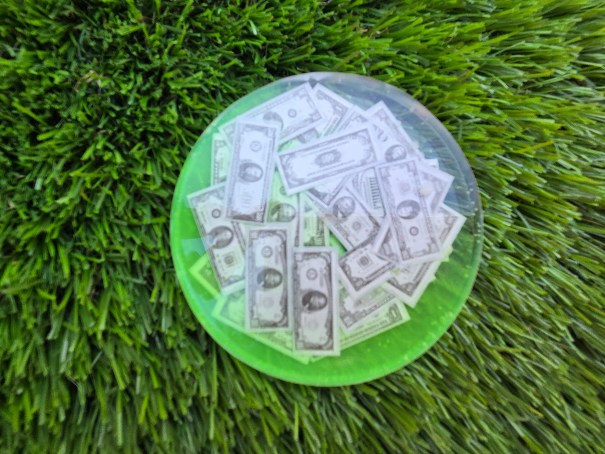 3.5inches. Glow pigment in epoxy. Mini cash embossed.
