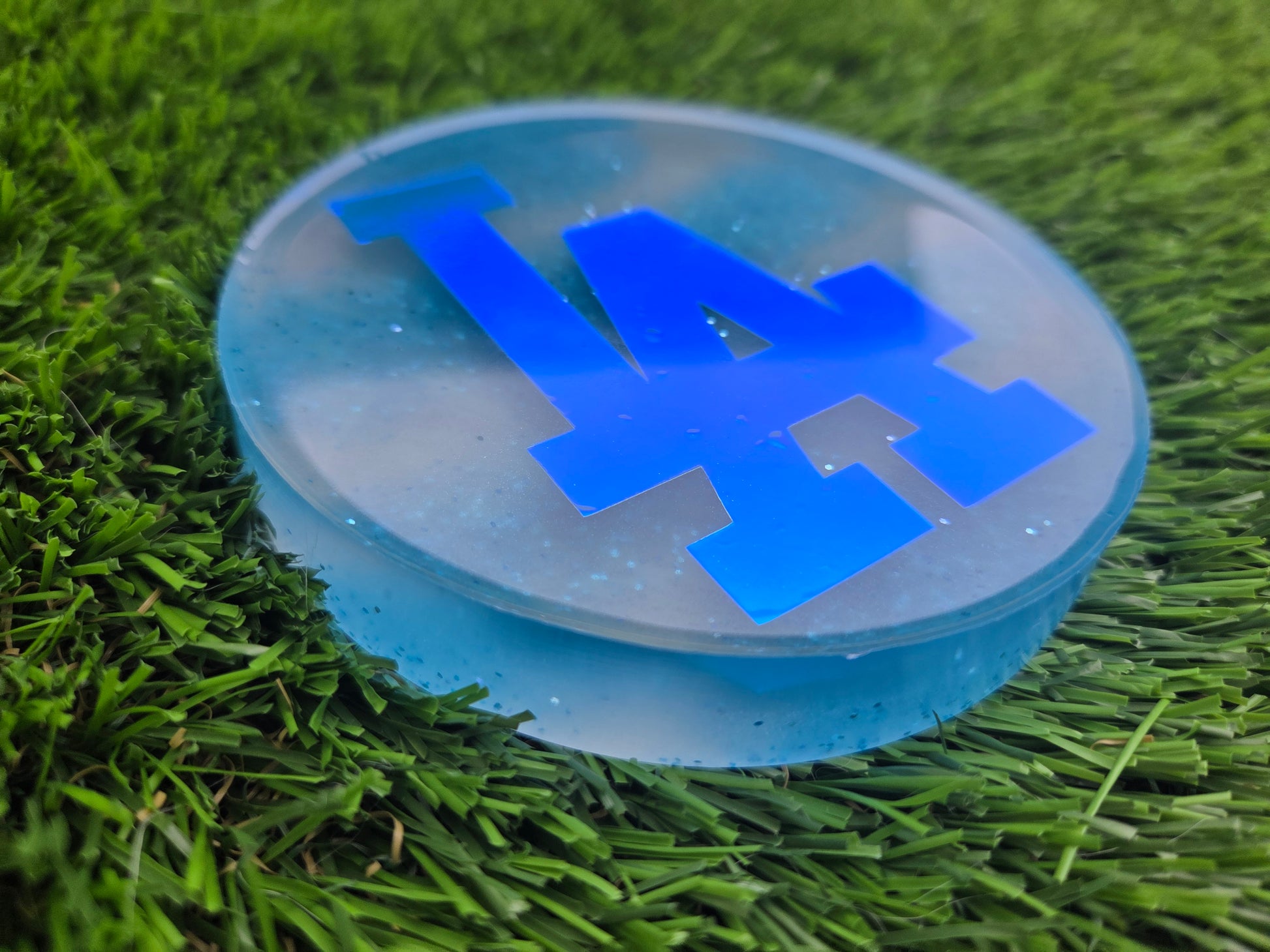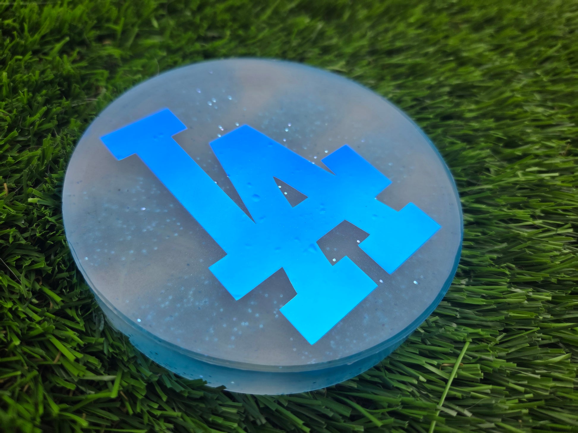 4inches. Super Glow pigment in epoxy. Iridescent Blue Vinyl.